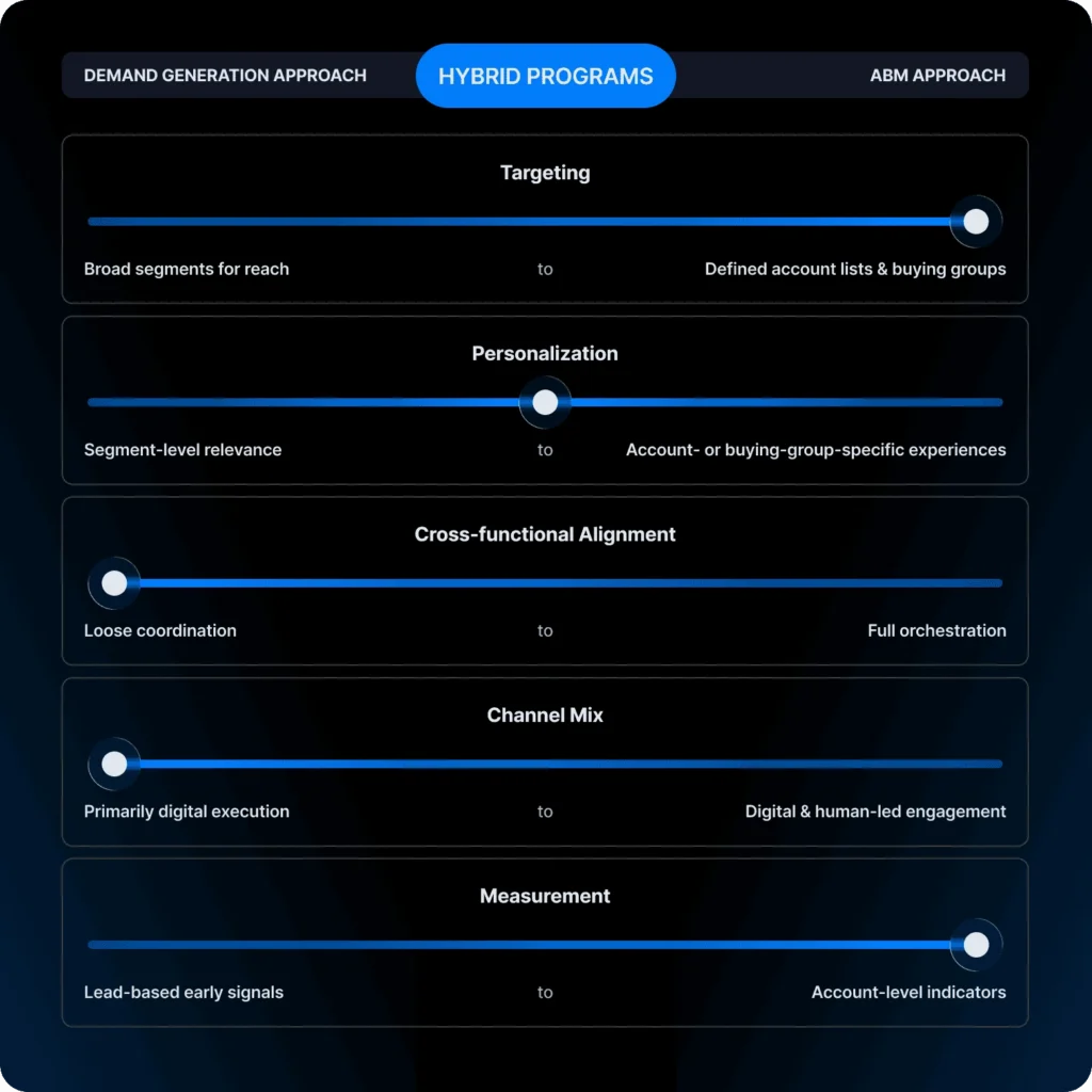 High-growth teams aren’t choosing between ABM and demand generation. They’re building hybrid demand generation programs that match the motion to the goal, adjust intensity through clear operational sliders, and measure success through a unified revenue lens.